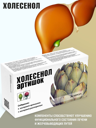 Для печени: Холесенол Артишок гепатопротектор, с экстрактами артишока и расторопши 0,4 г, 36 капсул
