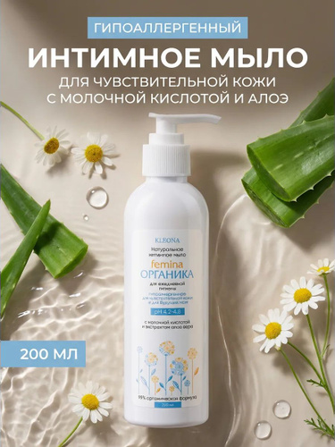 Мыло для интимной гигиены, гипоаллергенное Femina ОРГАНИКА с молочной кислотой и алоэ-вера, натуральное, для ежедневного ухода, 200 мл