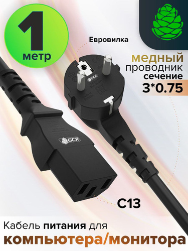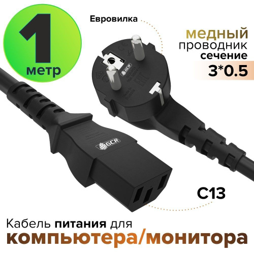 Провод питания для компьютера 1 метр сечение 3 x 0,5 мм евровилка угловая Schuko разъем C13 кабель GCR 220V черный кабель питания для монитора, для чайника
