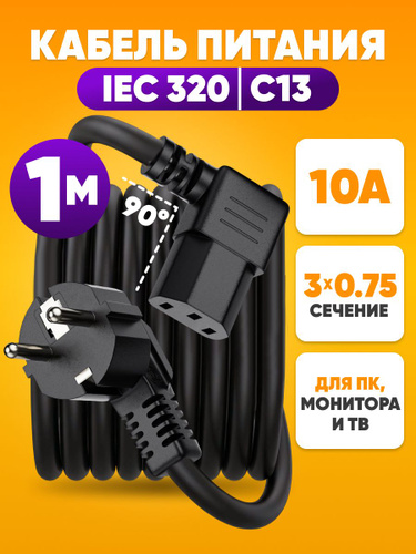 Угловой кабель питания сетевой 3 pin для компьютера 1м (евровилка шнур питания для процессора) IEC-C13