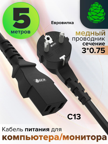 Шнур для блока питания 5 метров 3 x 0,75 мм кабель питания с13 разъем евро вилка угловая Schuko GCR 220 В черный провод питания для монитора, для бытового чайника