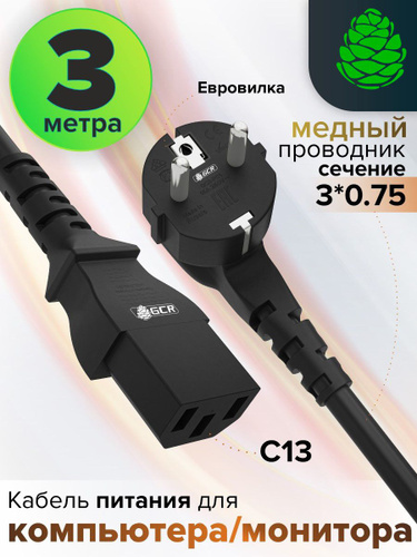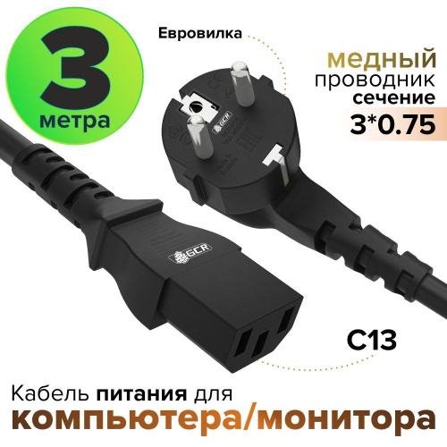 Кабель питания с13 3 метра сечение 3 x 0,75 мм евро вилка разъем C13 кабель GCR 220V черный сетевой провод для блока питания пк, для микроволновки