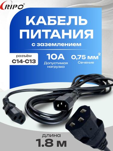 Кабель питания RIPO 1.8 м, С14-C13 (3*0.75 mm2), 10А, черный, с заземлением