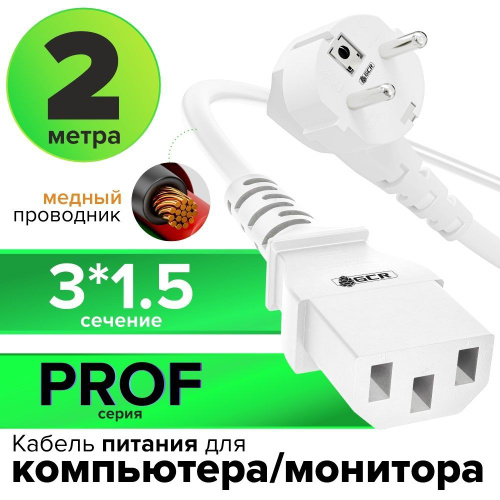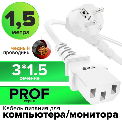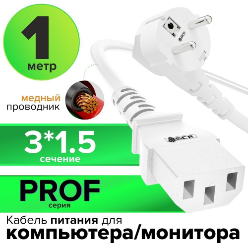 Провод питания для компьютера 1 метр PROF сечение 3 x 1,5 мм евровилка угловая Schuko разъем C13 кабель GCR 220В белый кабель питания для монитора, для сканера
