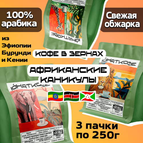 Набор кофе в зернах Африканские Каникулы 250г х 3шт, средняя свежая обжарка, натуральный, Бурунди Каянза, Эфиопия Сидамо Грейд 2, Кения Маунт, 100% арабика