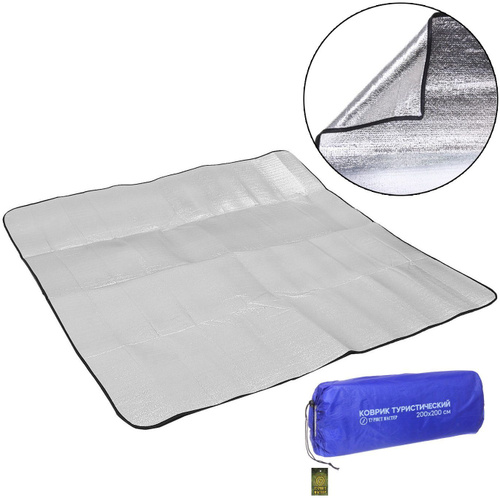 Коврик туристический VIVAT STYLE складной с фольгой в сумке. Цвет серебряный. Размер 200 х 200 см. Для тепла, палатки, загара, мягкости, удобства. От влаги, холода, сырости