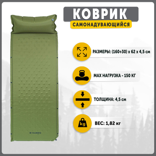 Коврик самонадувающийся туристический Talberg BASIC LARGE MAT, 190х62х4.5см, зеленый, с подушкой