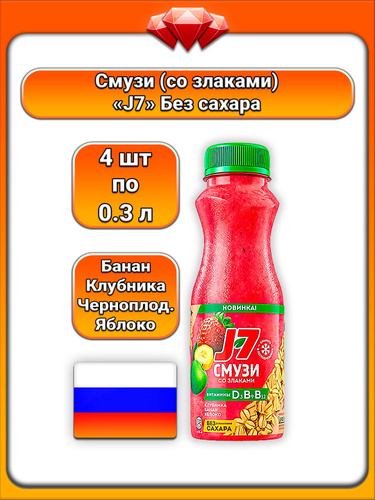 (4 x 300 мл) / J7, питьевой смузи со злаками, клубника яблоко банан черноплодная рябина, без добавления сахара, охлаждённый, натуральный фруктовый вкус, для перекуса