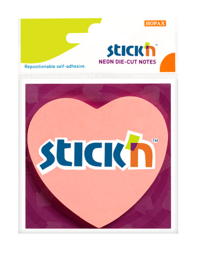 Блок самоклеящийся бумажный Stick'n 70x70 мм, 50 листов, 70г/м2, неон розовый, форма "сердце"