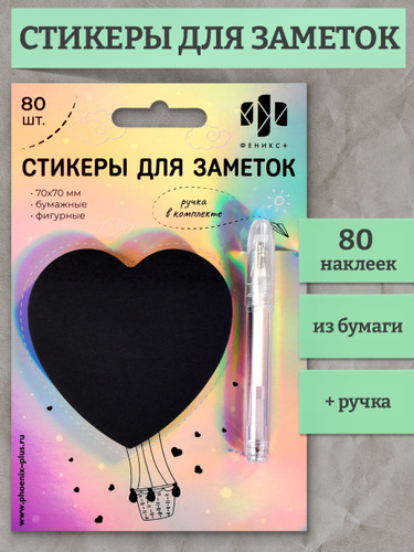 Стикеры для заметок бумажные "СЕРДЦЕ" 70х70 мм, 80 шт. чёрная бумага фигурная вырубка, белая гелевая ручка в комплекте.