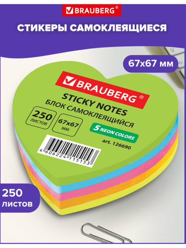 Бумага / стикеры / блок для заметок самоклеящиеся, фигурный, Brauberg, Неоновый Сердце, 250 листов, 5 цветов