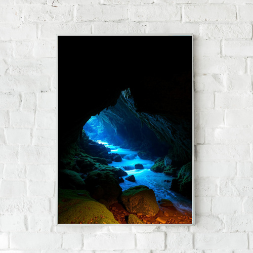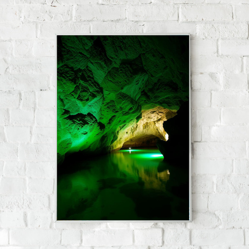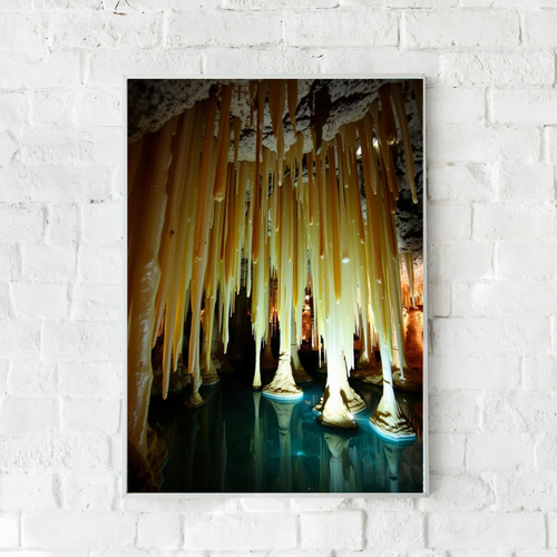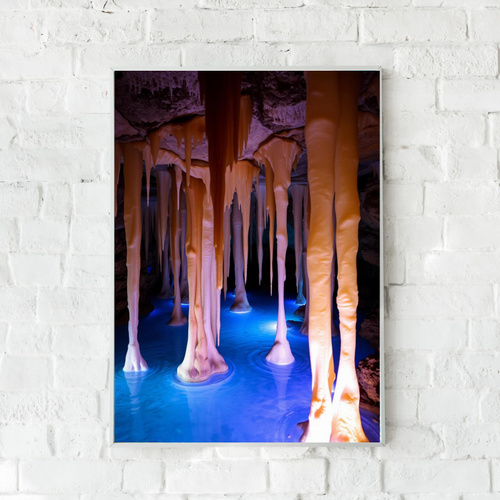 Постер 30х42 без рамы "Прозрачные сталагмиты в светящемся пещерном бассейне"