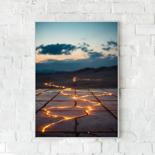 Постер 30х42 без рамы "Пустыня с плиточной поверхностью и светящимися трещинами"