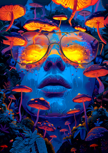 Психоделический рисунок с изображением лица, окруженного светящимися грибами, Поп Арт_019.