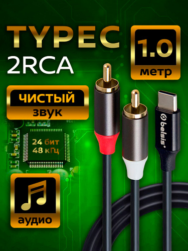 Кабель USB Type C 2RCA 24 бит / 48 кГц. Аудио Стерео длина 1.0 м, Belsis, совместим с домашним кинотеатром, саундбоксом, AV ресивером, Микшером, Car Audio и др/BW1626