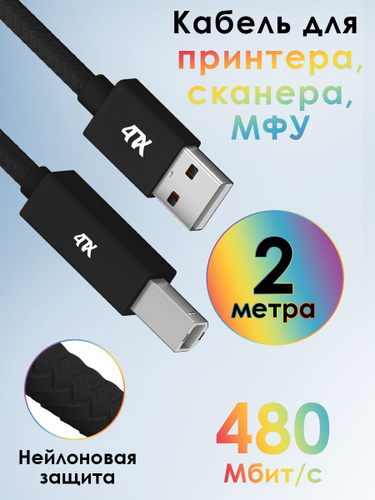 Шнур для принтера USB 2 метра AM/BM 4ПХ нейлон, черный