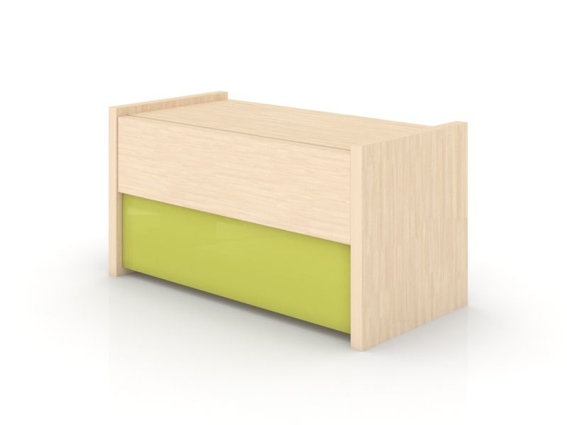 Корпус комода выполнен с акцентом на современный стиль модерн и отличается лаконичным внешним обликом без ручек. Фасады ящиков комбинируют древесную фактуру и яркое цветовое исполнение с глянцевой поверхностью, что добавляет мебели выразительности и подчеркивает динамику дизайна. Верхний ящик оформлен под дерево, а нижний украшен декоративным утопленным фасадом насыщенного цвета. Такое цветовое решение придает комоду индивидуальность и освежает атмосферу комнаты.