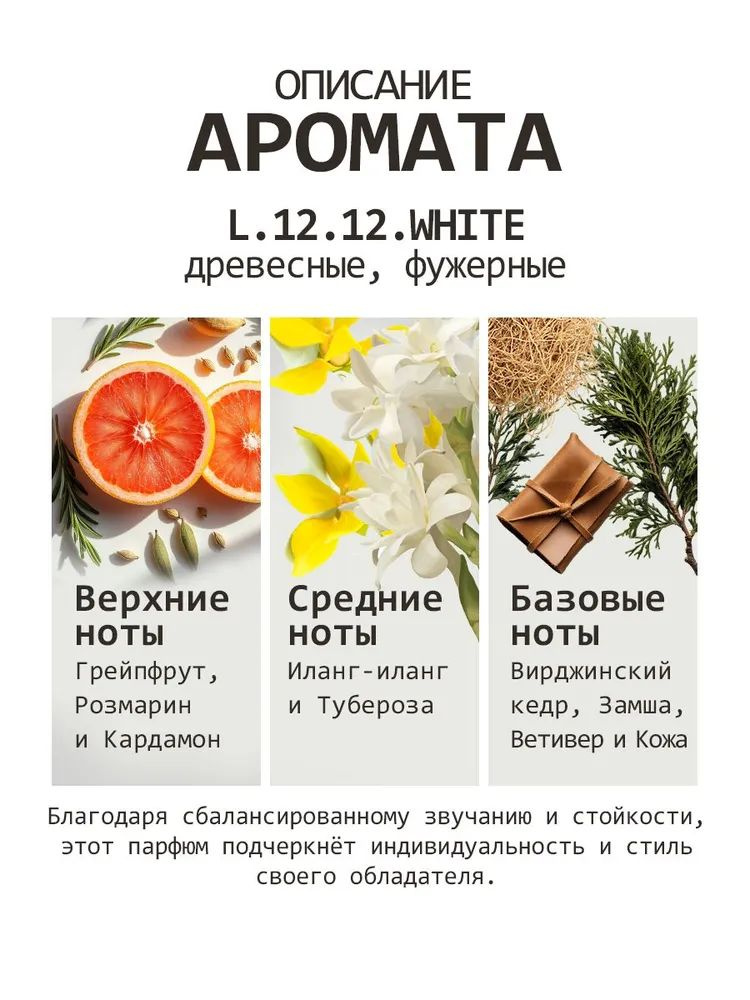 L.12.12 White духи — это премиальный, стильный и универсальный мужской аромат, идеальный для ценителей классики с современным звучанием.