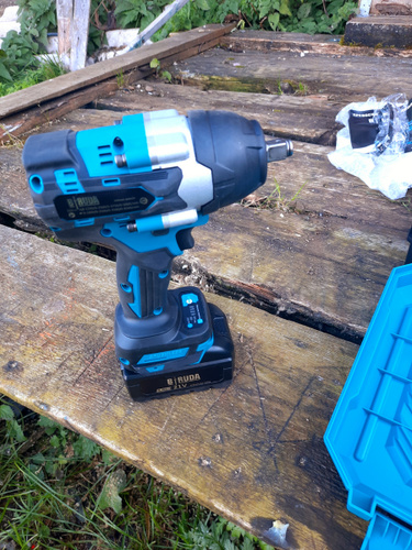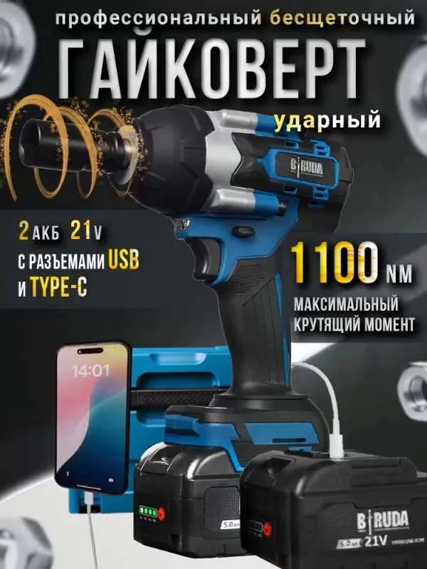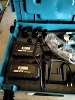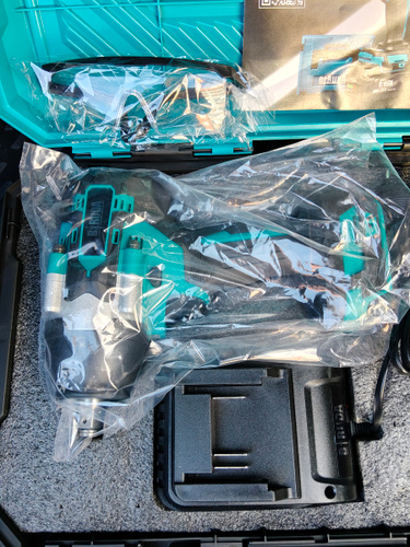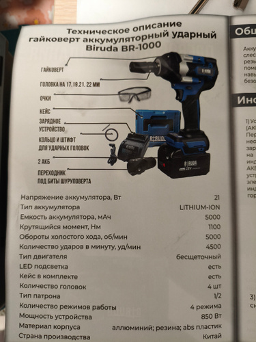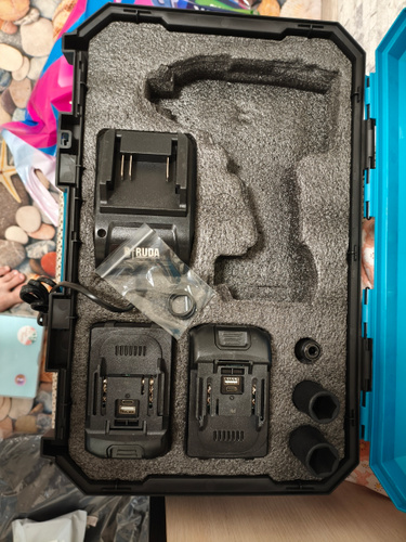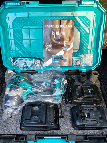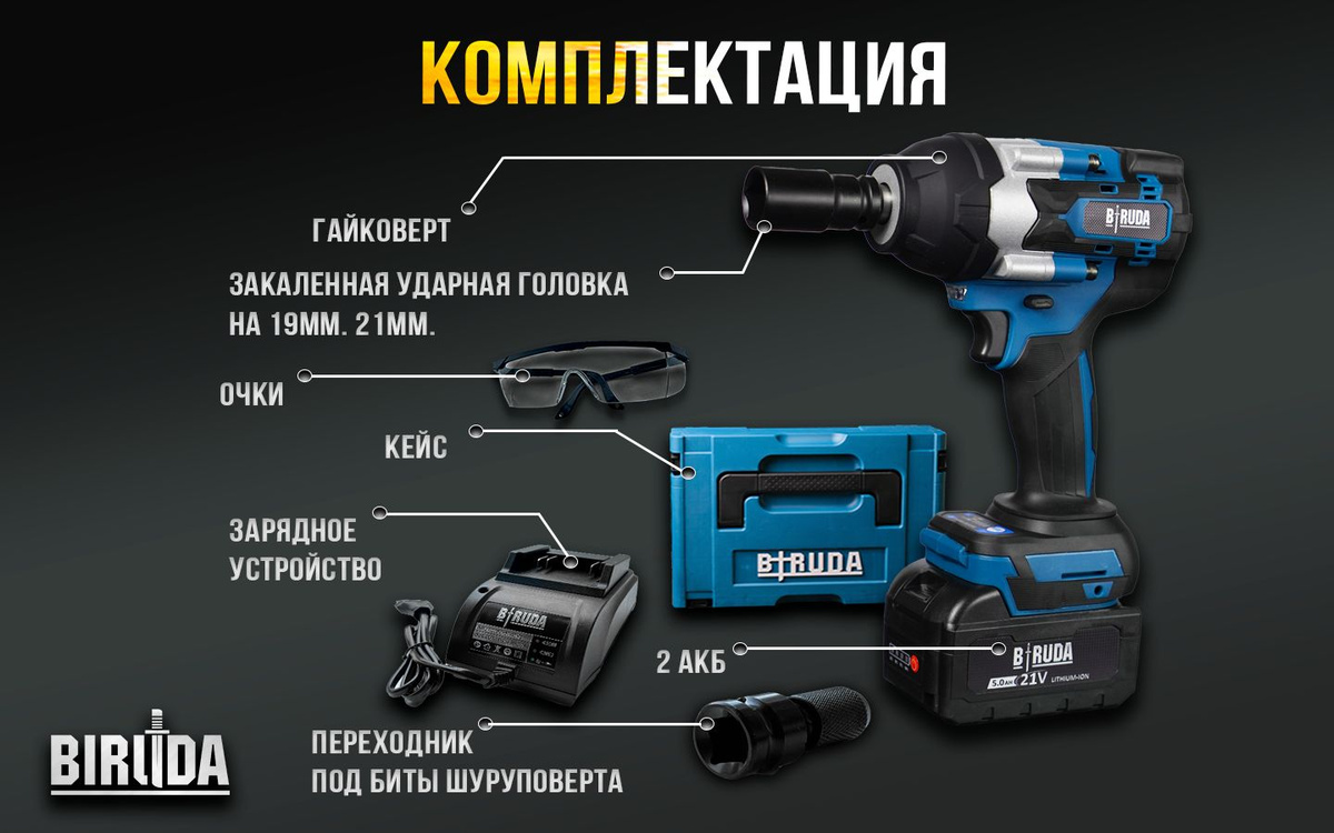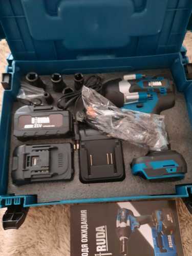 Кейс, гайковерт, 2 аккумулятора, зарядное устройство, 2 ударных головки, переходник под биты шуруповерта, защитные очки.