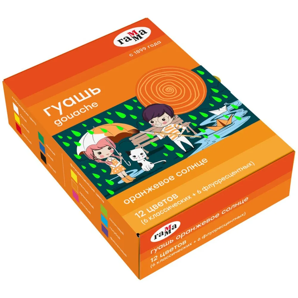 Гуашь ГАММА Оранжевое солнце 12 цветов по 20 мл (6 флуор; 6 классич.)