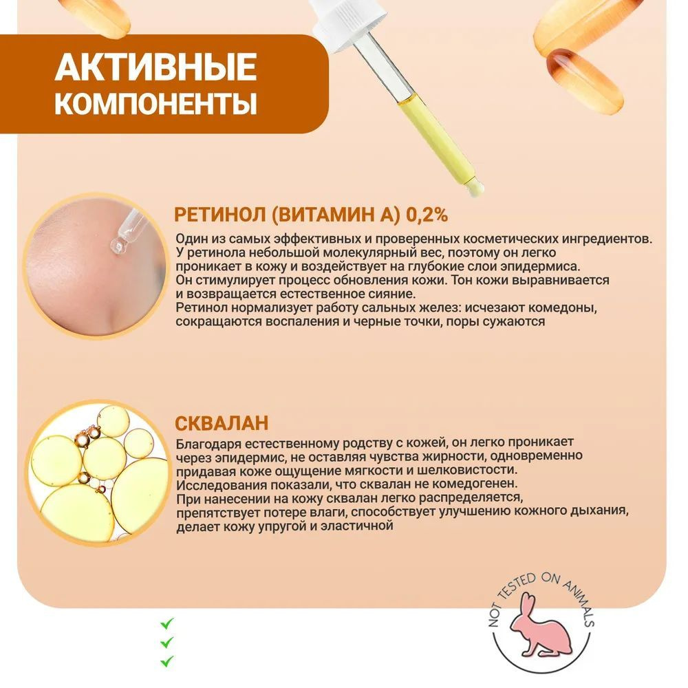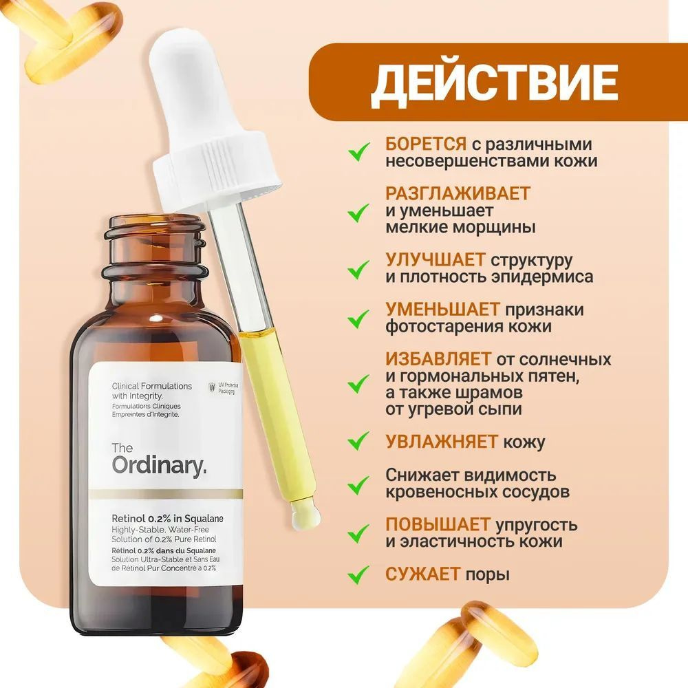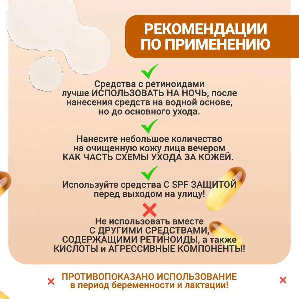 Нанесите небольшое количество крема вечером до использования увлажняющих средств, масел и кремов. Не используйте эту сыворотку с другими средствами, содержащими ретиноиды, такими как ретиноидовая кислота. Ретиноиды могут сделать вашу кожу более чувствительной к УФ лучам. В течение дня носите солнцезащитный крем, если вы используете данное средство. Если возникнет раздражение, крем можно разбавить, чтобы ослабить концентрацию.
