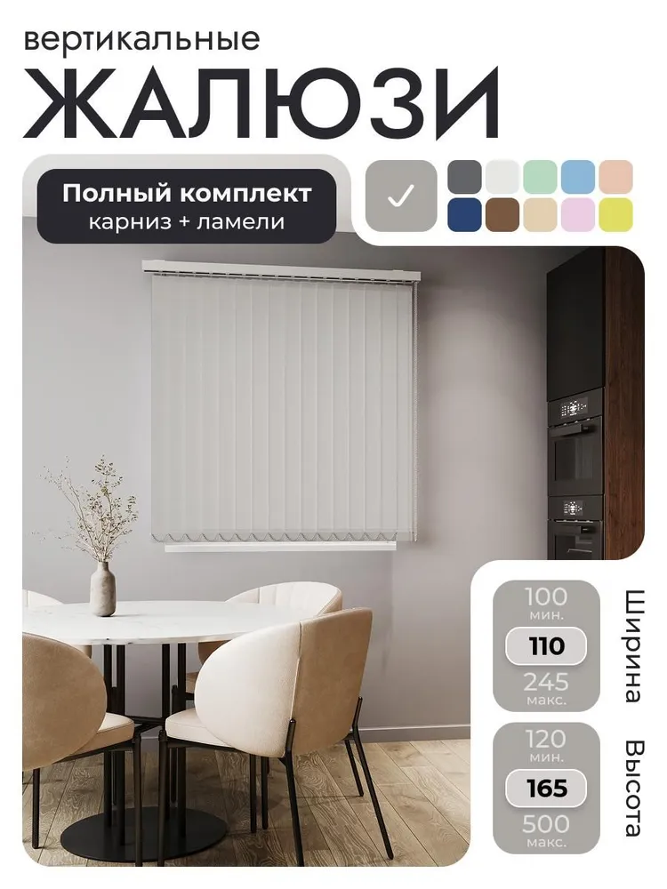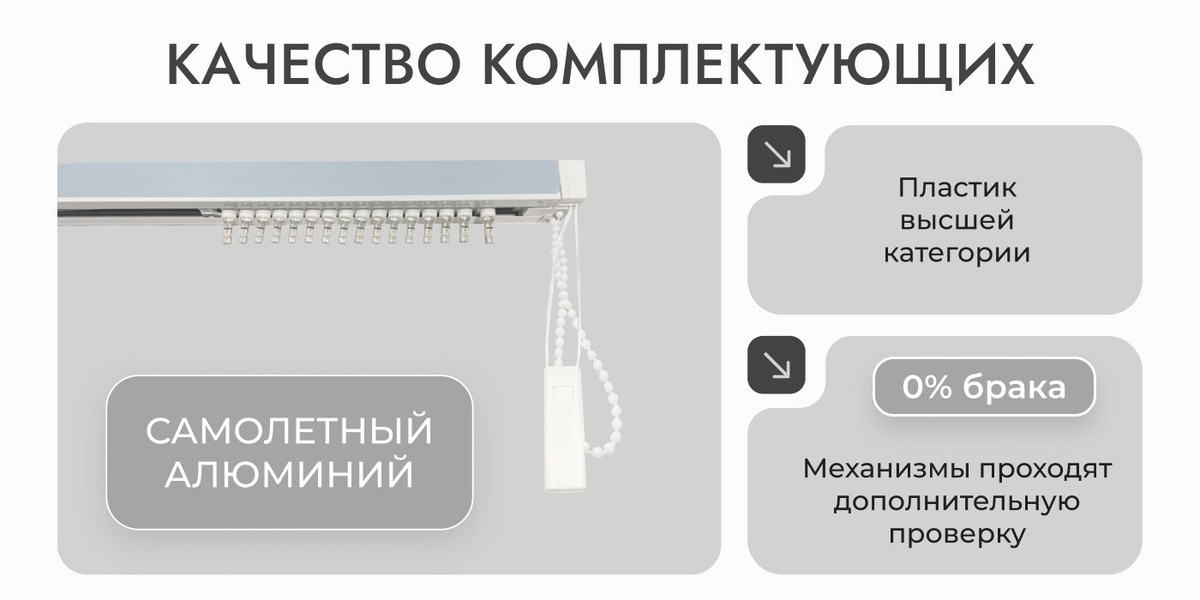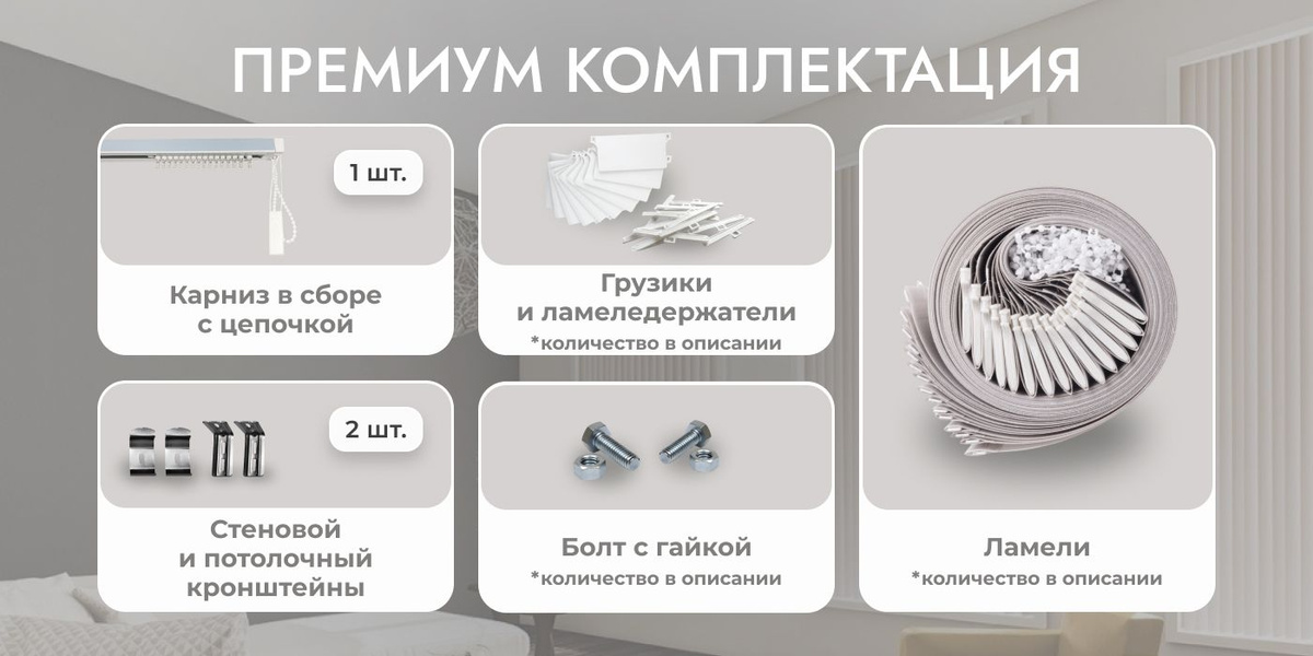 Карниз в сборе с цепочкой - 1 шт, ламели 14 шт., стеновой кронштейн - 2 шт.,потолочный кронштейн - 2 шт.,болт/гайки- 2 шт.